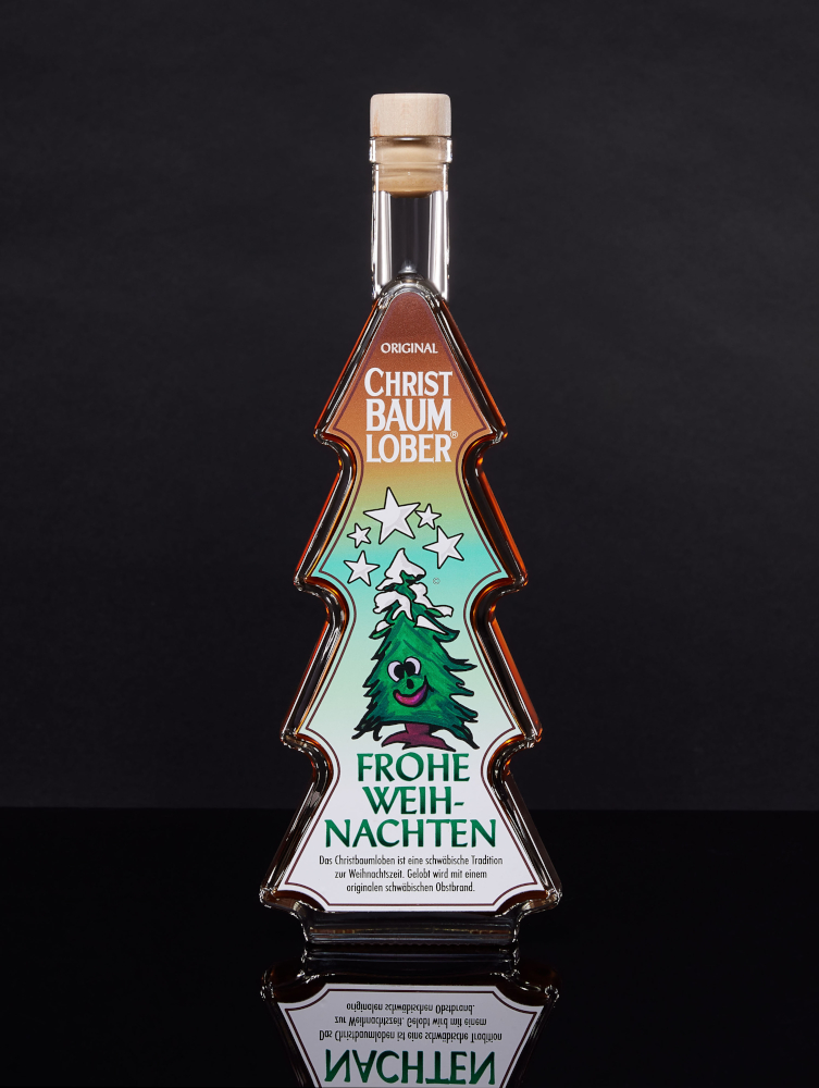 Der Christbaumlober in der Tannenbaum-Schmuckflasche mit dem Motiv-Etikett "Frohe Weihnachten" ist ein ideales Geschenk zu Weihnachten und um die Liebe unter dem Weihnachtsbaum sprechen zu lassen.